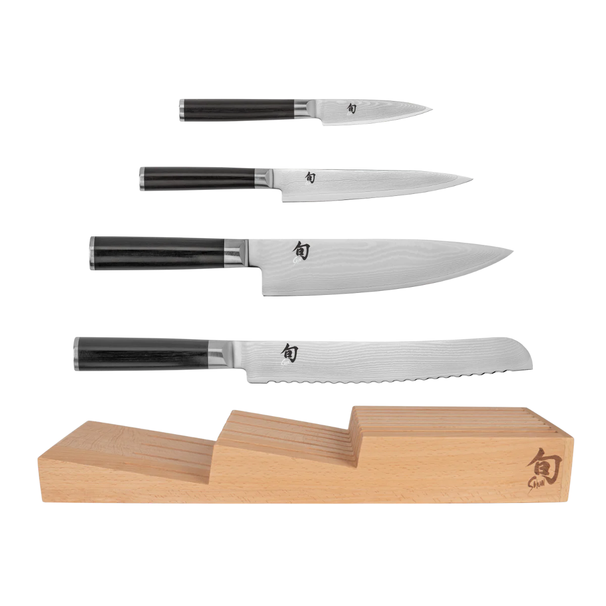 Made in Japan. The Shun Classic 5-Piece Starter Block set includes three of the most essential Shun knives, plus the Shun Classic Combination Honing Steel and a beautiful 6-slot Slimline Block. You'll get the 8-in. Chef's Knife, the 3.5-in. Paring...