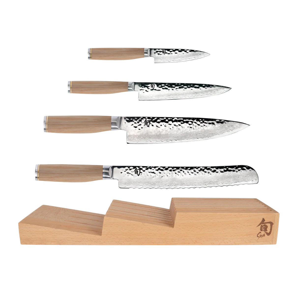 Made in Japan. Start your Shun Premier Blonde collection with this beautifully practical in-drawer knife set. You’ll get four essential kitchen knives, ideal for everything from delicate prep to slicing crusty breads, neatly stored in a space-saving beechwood knife tray....