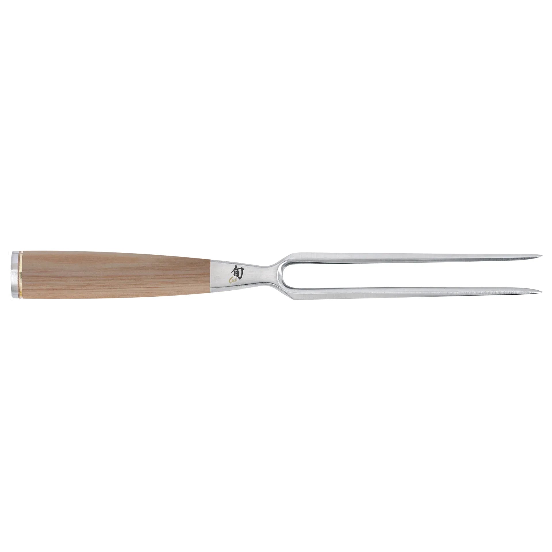 Made in Japan/China. The Shun Classic Carving Fork is an elegant match for the Shun Classic Slicing Knife. This two-pronged fork easily holds food in place while slicing or carving and assists in serving, too. The long tines of a...